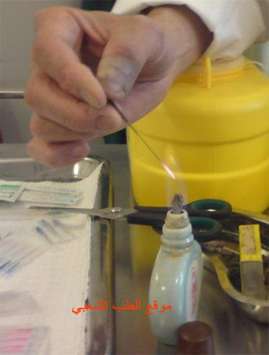 قلت وهذه الطريقة قريبة من الطريقة العربية المسماة " بالكي البعري " وطريقتها كما عن الرازي في الحاوي في الطب : يؤخذ بعر الماعز ولا سيما الجبلي : تشرب صوفة زيتا وتوضع على الموضع المراد كيه ثم خذ بعرة والهبها حتى تصير جمرة ثم ضعها على الصوف ولا تزال تفعل ذلك حتى يصل الحس بتوسط العصب ويسكن الألم. " بتصرف "